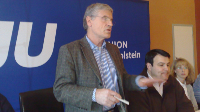 Helmut Siegmon vom Philologenverband Schleswig-Holstein spricht mit den Delegierten zum Schleswig-Holstein Rat.