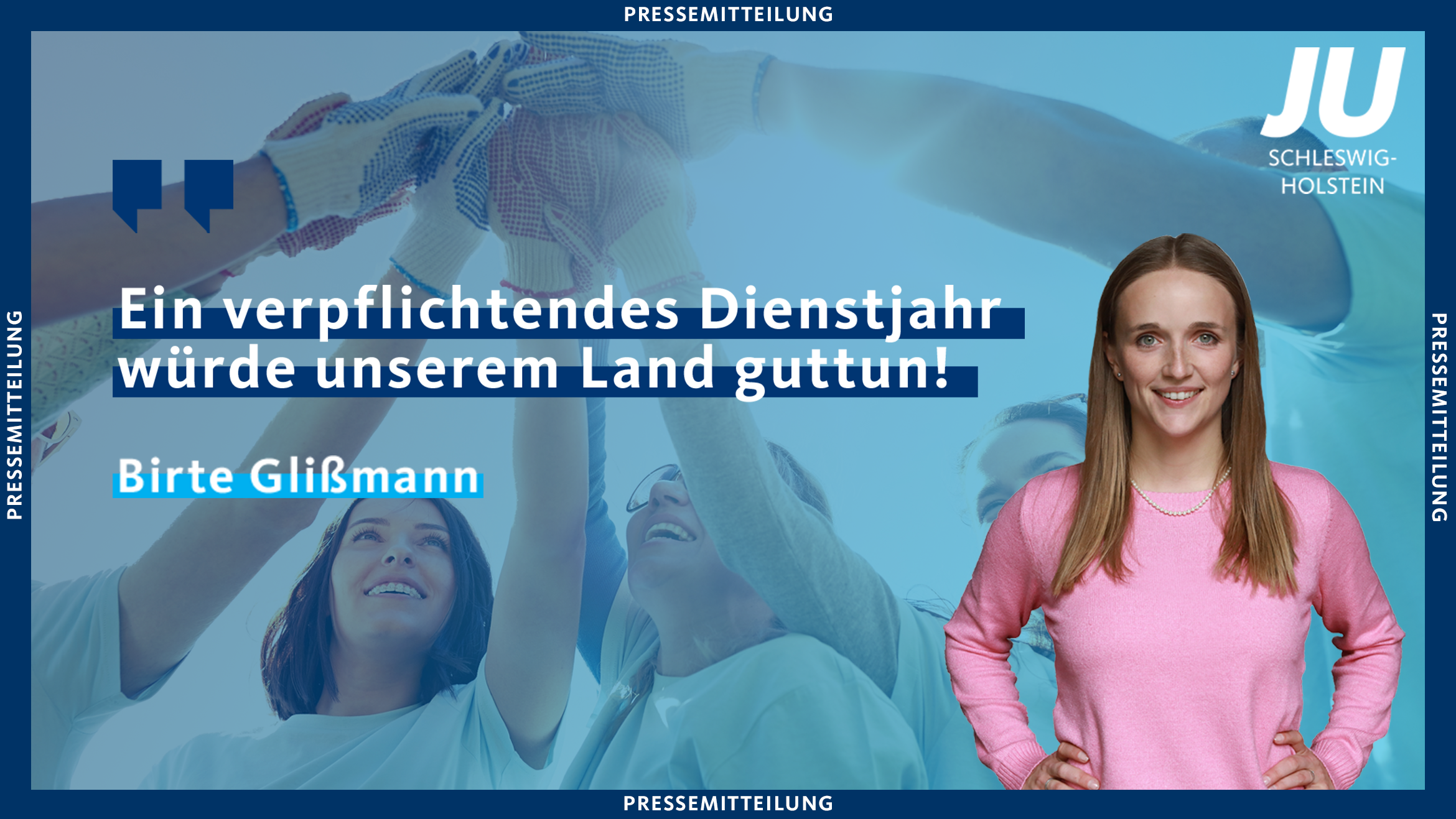 Zum Vorschlag des Bundespräsidenten, einen sozialen Pflichtdienst einzuführen, erklärt die Landesvorsitzende der Jungen Union Schleswig-Holstein, Birte Glißmann: „Der Vorschlag des Bundespräsidenten, einen sozialen Pflichtdienst einzuführen, stößt bei der Jungen Union Schleswig-Holstein auf große Unterstützung. In den vergangenen Jahren haben wir uns immer wieder für eine allgemeine Dienstpflicht eingesetzt. Ich bin überzeugt, dass es unserem Land guttun würde, wenn sich junge Menschen für ein Jahr in den Dienst der Gesellschaft stellen. Dies stärkt den gesellschaftlichen Zusammenhalt, der in den vergangenen Jahren teilweise stark nachgelassen hat.“