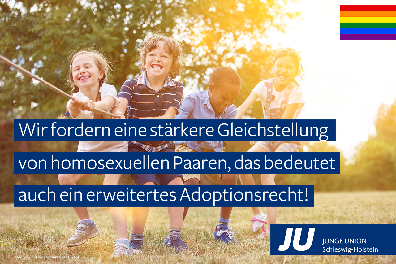 Ebenso fordert die Junge Union eine Anpassung des Adoptionsrechts für homosexuelle Paare: „Als Junge Union fordern wir bereits seit vielen Jahren die Gleichstellung von gleichgeschlechtlichen Lebenspartnerschaften. Die CDU Schleswig-Holstein hat im letzten Jahr diese Forderung übernommen. Ein Vorgang, der auch auf Bundesebene Beachtung fand. Auf dem Schleswig-Holstein-Tag haben wir intensiv über das Adoptionsrecht von homosexuellen Paaren diskutiert. Schon heute ist eine Sukzessiv-Adoption möglich – wir machen uns auch bei diesem Thema für eine stärkere Gleichstellung stark. Wenn zwei Menschen die Werte der Fürsorge, des Zusammenhalts und der Verantwortung in einer Familie leben wollen, sollte hierbei nicht die sexuelle Orientierung, sondern Liebe und Verantwortung ausschlaggebend sein“, ergänzt der stellvertretende JU-Landesvorsitzende Max Schmachtenberg.