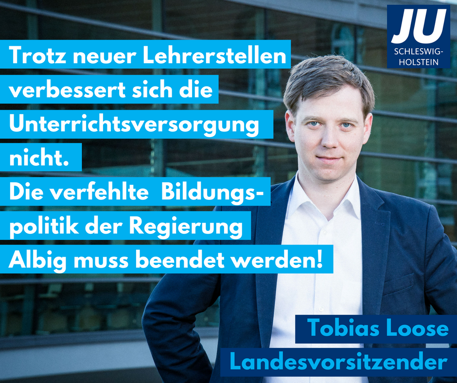 Zu diesen Zahlen erklärt der Landesvorsitzende der Jungen Union Schleswig-Holstein und stellv. Landesvorsitzende der CDU Schleswig-Holstein, Tobias Loose: „Die neuen Zahlen sind ein glatte 6 für die Schulpolitik der Landesregierung. Es gibt keine Verbesserungen bei dem drängenden Problem des Unterrichtsausfalls und der Unterrichtsversorgung im vergangenen Jahr. Der Ankündigungsrhetorik der Ministerin Ernst müssen endlich spürbare Taten folgen.