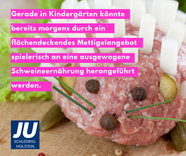 „Wir erwarten von der Landesregierung in dieser Frage mehr politischen Gestaltungsanspruch, der über Symbolpolitik hinausgeht. Daher fordert die Junge Union Schleswig-Holstein die Umbenennung des Mittwochs in Mettwoch durch ein Landesgesetz. Der Mettwoch soll in Zukunft in Sachen Ernährung ganz dem Schweinefleisch gewidmet sein. Dies sollte ein verpflichtendes Angebot für öffentliche Kantinen sein. Gerade in Kindergärten könnte bereits morgens durch ein flächendeckendes Mettigelangebot spielerisch an eine ausgewogene Schweineernährung herangeführt werden.